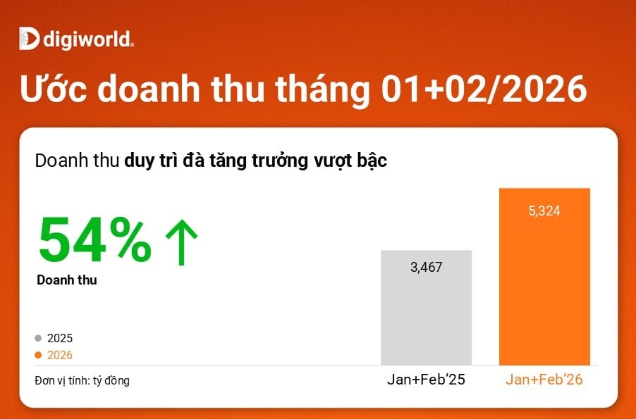 (Banker.vn) Dù kỳ nghỉ Tết rơi vào tháng 2, Digiworld vẫn ghi nhận doanh thu hơn 2.200 tỷ đồng trong tháng, đưa lũy kế hai tháng đầu năm tăng 54% so với cùng kỳ và tiến sát mục tiêu lợi nhuận quý I.