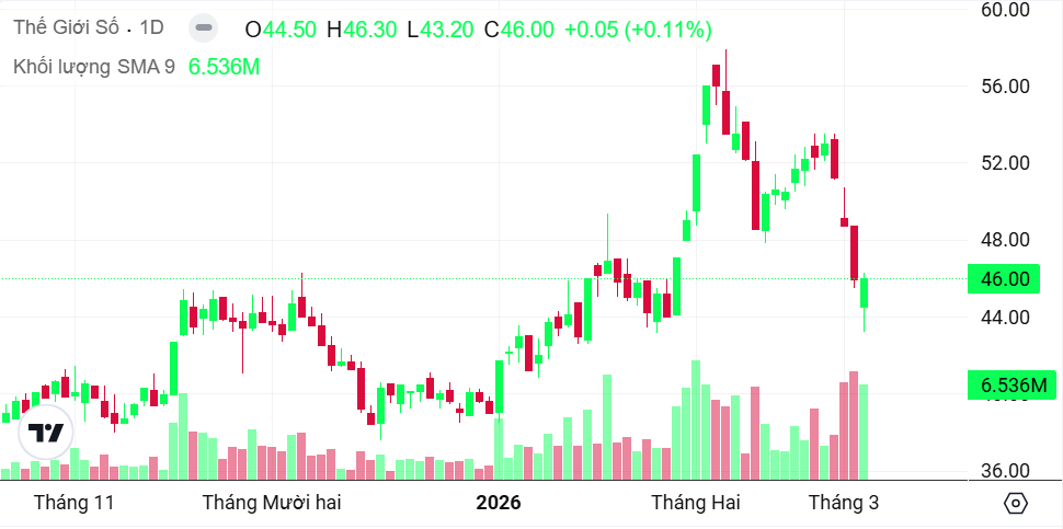 margin: 15px auto;" />Trên sàn chứng khoán, cổ phiếu DGW nhìn chung vẫn đang vận động trong một pha đi ngang. Kết phiên giao dịch ngày 04/03/2026, cổ phiếu DGW đóng cửa ở giá 46.000 đồng. So với cách đây 1 tháng, thị giá của DGW đã giảm khoảng 26%. Price to Earnings Ratio" data-glossary-def="Tỷ lệ giá cổ phiếu trên thu nhập - chỉ số định giá phổ biến nhất.">P/E hiện tại của DGW ở mức 20,67 và P/B ở mức 3,30 trong Q4 2025 đã giảm đáng kể so với đỉnh điểm giai đoạn 2021-2022 (P/E trên 25 và P/B trên 6).