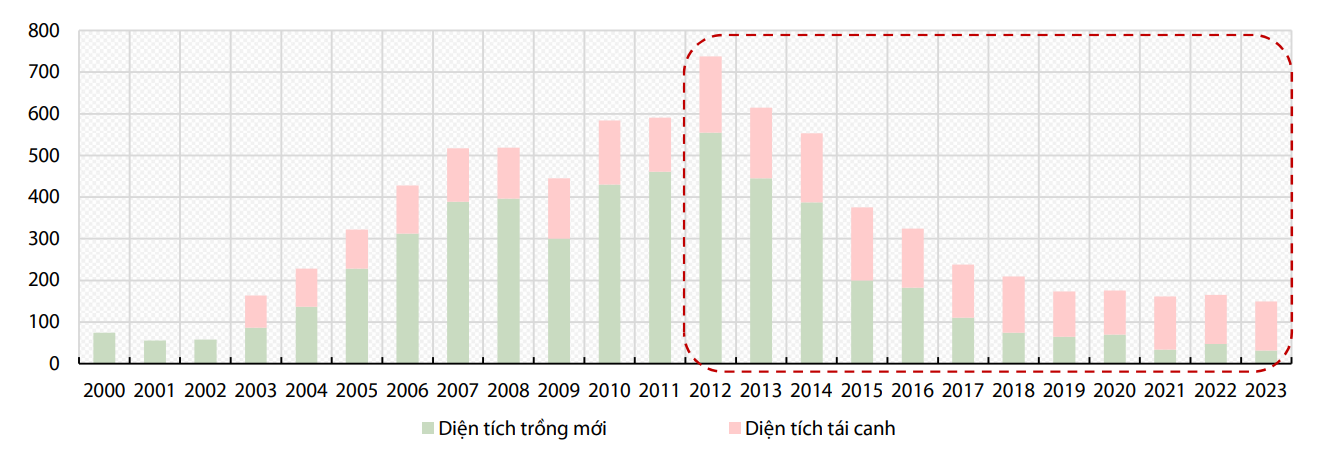 Về dài hạn, triển vọng của ngành cao su được đánh giá tích cực hơn khi nguồn cung toàn cầu có dấu hiệu thắt chặt. Một trong những nguyên nhân quan trọng là diện tích trồng mới cao su trên thế giới đã liên tục thu hẹp trong giai đoạn 2012–2023, khiến khả năng gia tăng sản lượng trong ngắn hạn trở nên hạn chế.