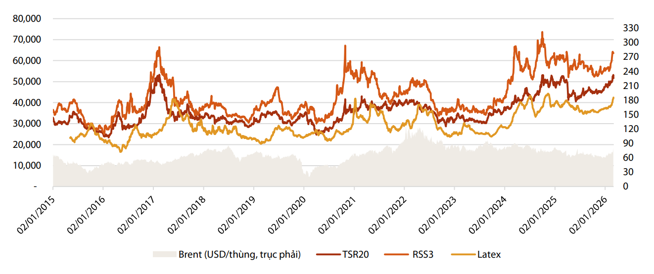 Trên cơ sở đó, mặt bằng giá cao su trong trung và dài hạn được kỳ vọng duy trì ở mức nền tương đối cao, khoảng 48–50 triệu đồng/tấn, tương đương vùng giá cuối năm 2025. Tuy vậy, triển vọng này vẫn cần tiếp tục theo dõi các yếu tố ảnh hưởng tới cung – cầu của thị trường, bao gồm sản lượng từ các quốc gia sản xuất lớn, điều kiện thời tiết, biến động của giá dầu cũng như xu hướng tiêu thụ từ ngành công nghiệp lốp xe toàn cầu.