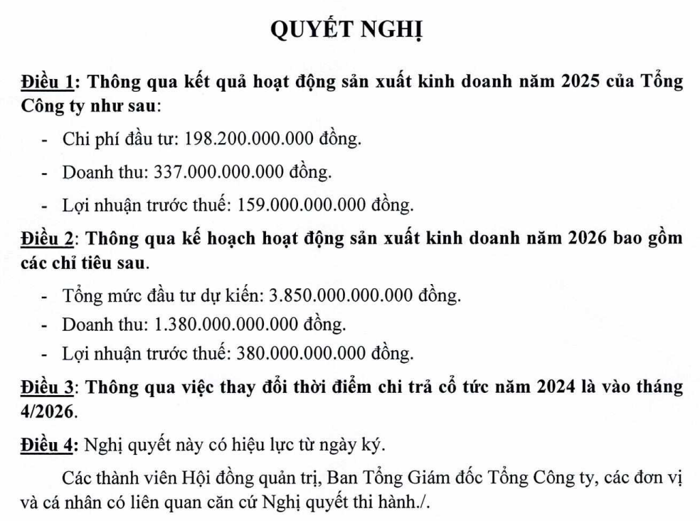 Cùng với kế hoạch kinh doanh, HĐQT Saigonres cũng thông qua việc điều chỉnh thời điểm chi trả cổ tức năm 2024 sang tháng 4/2026. Trước đó, doanh nghiệp dự kiến thực hiện chi trả trong quý III/2025 với tổng giá trị khoảng 60 tỷ đồng.