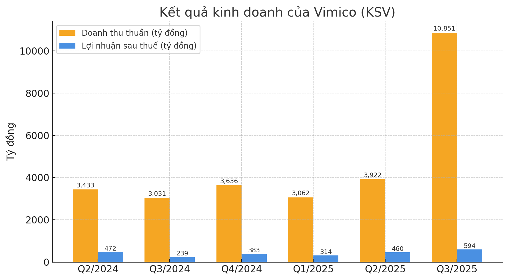 Trong kỳ, doanh thu thuần trong quý đạt 10.851 tỷ đồng, tăng 13% so với cùng kỳ, sau khi khấu trừ đi các khoản chi phí và giá vốn, lợi nhuận sau thuế hợp nhất của Vimico đạt gần 594 tỷ đồng, tăng mạnh tới 148% so với cùng kỳ năm 2024 (239 tỷ đồng), đưa lợi nhuận lũy kế 9 tháng lên 1.367 tỷ đồng, cao hơn 73% so với năm trước.