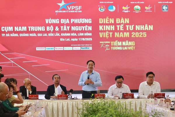 Ngày 17/8, tại phường Pleiku (tỉnh Gia Lai), đã diễn ra Diễn đàn Kinh tế tư nhân Việt Nam 2025 (VPSF 2025) - Phiên đối thoại cụm Nam Trung Bộ và Tây Nguyên (gồm TP. Đà Nẵng và các tỉnh Quảng Ngãi, Gia Lai, Đắk Lắk, Khánh Hoà và Lâm Đồng).
