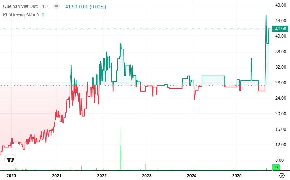 Trên sàn HNX, cổ phiếu QHD của Công ty CP Que hàn điện Việt Đức vừa trải qua giai đoạn tăng giá ấn tượng khi ghi nhận chuỗi 6 phiên tăng trần liên tiếp từ ngày 28/10 đến 4/11/2025. Đà tăng mạnh đẩy thị giá QHD lên mức 45.400 đồng/cổ phiếu, cao nhất kể từ khi doanh nghiệp niêm yết vào năm 2010.