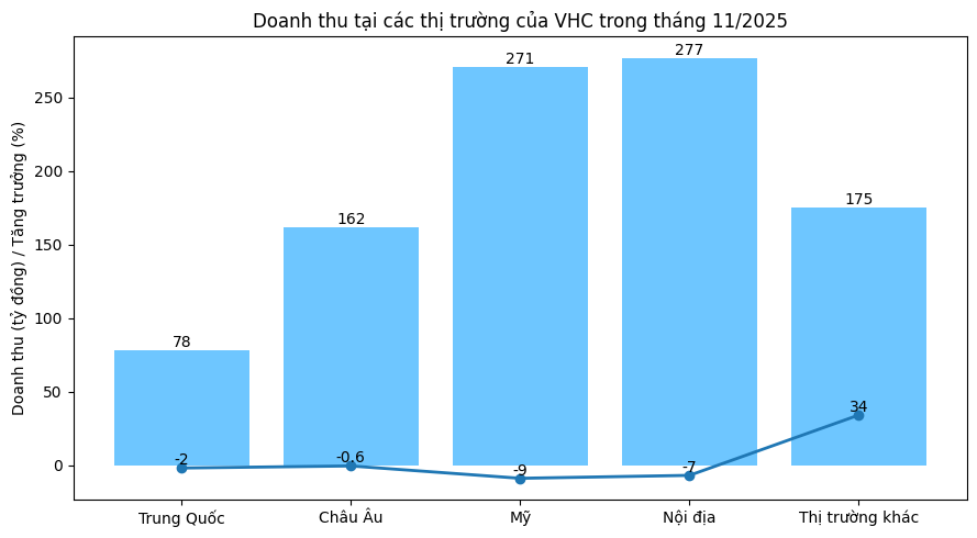 Trong tháng 11/2025, bức tranh doanh thu của Công ty CP Vĩnh Hoàn (HOSE: VHC) cho thấy nhiều gam màu trầm tại các thị trường chủ lực. Trong đó, Mỹ và Việt Nam tiếp tục là hai điểm giảm mạnh nhất khi doanh thu cùng sụt 9% so với cùng kỳ năm trước.
