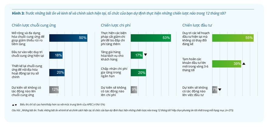 Ở góc độ chi phí, doanh nghiệp đang ưu tiên các biện pháp kiểm soát và cắt giảm, với 53% cho rằng cần triển khai các chương trình tiết kiệm nhằm bù đắp chi phí tăng cao. Tuy nhiên, một tỷ lệ nhỏ hơn (17%) sẵn sàng chuyển phần chi phí tăng này sang giá bán, cho thấy sự dè dặt vì lo ngại ảnh hưởng đến nhu cầu khách hàng.