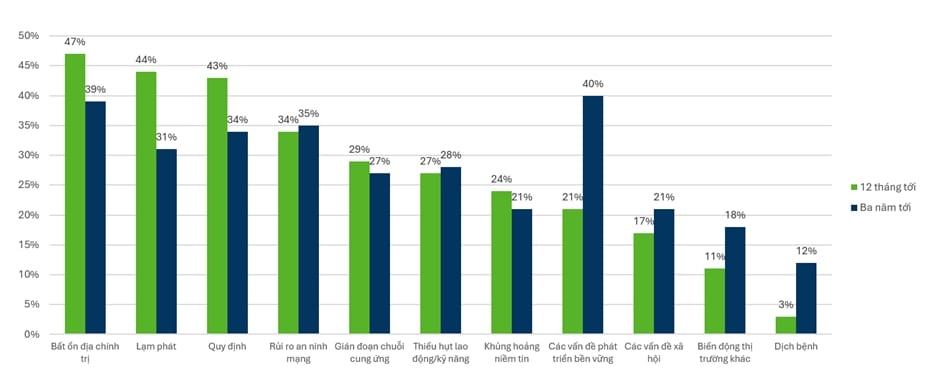 Với Việt Nam, trong năm tới, bất ổn địa chính trị và quy định có thể sẽ là hai thách thức lớn nhất với cộng đồng doanh nghiệp.