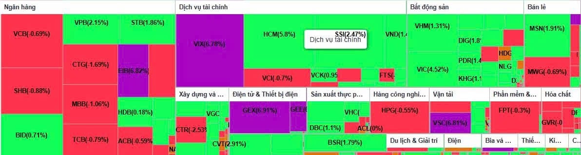 Ở nhóm vốn hóa lớn, điểm nhấn đáng chú ý là SAB khi cổ phiếu này tăng trần, trong bối cảnh nhiều bluechip khác chỉ tăng nhẹ hoặc phân hóa. Một số mã như STB, PLX, MSN, VPB hay SSI duy trì mức tăng quanh 2%, hỗ trợ chỉ số nhưng không tạo hiệu ứng lan tỏa quá mạnh. Ở chiều ngược lại, sắc đỏ chiếm ưu thế hơn, song áp lực điều chỉnh không lớn khi các mã giảm mạnh nhất cũng chỉ lùi quanh 2–3%.