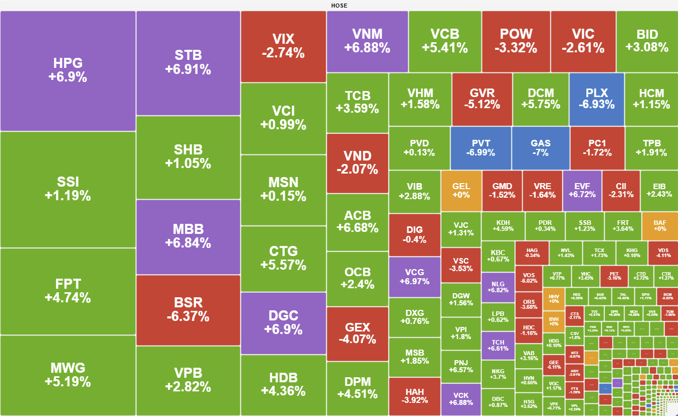 Kết thúc phiên giao dịch, sàn HOSE có 258 mã tăng và 88 mã giảm, VN-Index tăng 23,94 điểm (+1,45%), lên 1.676,73 điểm. Tổng khối lượng giao dịch đạt hơn 1,52 tỷ đơn vị, giá trị đạt 41.477,2 tỷ đồng, tăng hơn 10% về khối lượng nhưng chỉ tăng nhẹ hơn 1% về giá trị so với phiên sáng hôm qua. Giao dịch thỏa thuận đóng góp gần 194 triệu đơn vị, giá trị đạt 3.577 tỷ đồng.