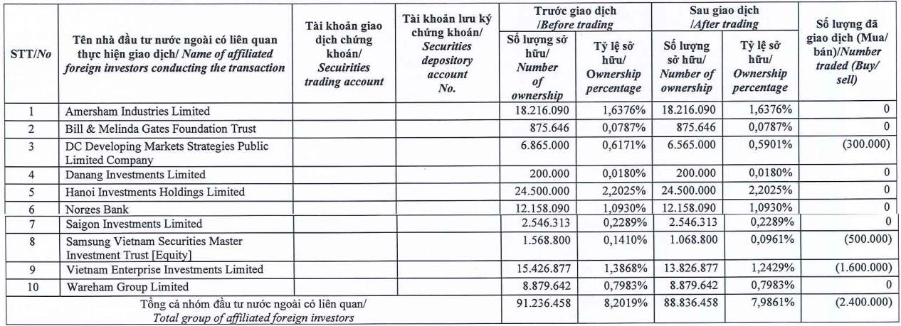 Trong đó, quỹ Vietnam Enterprise Investments Limited bán ra 1,6 triệu cổ phiếu; quỹ Samsung Vietnam Securities Master Investment Trust (Equity) bán ra 500.000 cổ phiếu và quỹ DC Developing Markets Strategies Public Limited Company bán ra 300.000 cổ phiếu.