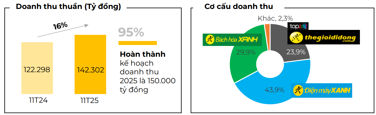 Về tình hình kinh doanh, 11 tháng năm 2025, MWG đạt 142.302 tỷ đồng doanh thu, tăng 16% so với cùng kỳ năm ngoái và hoàn thành 95% kế hoạch năm. Trong đó, hai chuỗi Thế Giới Di Động và Điện Máy Xanh đóng góp gần 96.500 tỷ đồng, tăng 18% so với cùng kỳ; chuỗi Bách Hóa Xanh đạt gần 42.600 tỷ đồng, tăng 14%; các chuỗi khác như EraBlue, An Khang, AVAKids cũng ghi nhận kết quả kinh doanh tăng trưởng tích cực.