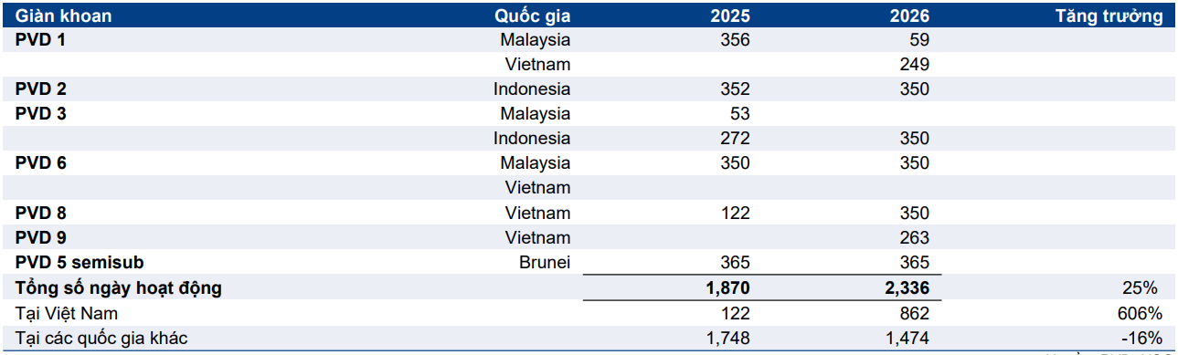 Sau khi mua thêm giàn khoan mới, PVD đã điều chỉnh chiến lược theo hướng “ưu tiên thị trường Việt Nam”, theo đó tổng số ngày hoạt động của các giàn khoan thuộc sở hữu PVD tại Việt Nam trong năm 2026 dự kiến đạt 862 ngày, gấp hơn sáu lần so với năm 2025. Nhờ đó, tổng số ngày làm việc toàn hệ thống cũng tăng lên 2.336 ngày, tức tăng khoảng 25% so với năm trước.