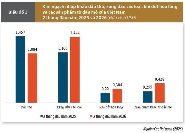 Bên cạnh đó, dấu hiệu suy giảm điều kiện thương mại đã xuất hiện khá rõ trong dữ liệu hai tháng đầu năm 2026. Theo số liệu sơ bộ của Cục Hải quan, lũy kế đến hết tháng 2/2026, Việt Nam nhập khẩu 2,16 triệu tấn dầu thô trị giá 1,084 tỉ USD, 2,18 triệu tấn xăng dầu các loại trị giá 1,444 tỉ USD, 538 nghìn tấn khí đốt hóa lỏng trị giá 304,8 triệu USD và 427,9 triệu USD sản phẩm khác từ dầu mỏ (Biểu đồ 3).