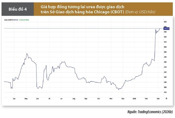 Tác động tới nông nghiệp cũng rất đáng chú ý. Căng thẳng tại Trung Đông không chỉ ảnh hưởng đến dầu mỏ mà còn liên quan trực tiếp đến khí hóa lỏng, urea, amoniac, phosphates và các nguyên liệu đầu vào quan trọng khác cho sản xuất nông nghiệp. Đặc biệt, tính tới giữa tháng 3/2026, giá urea đã tăng lên mức 594 USD/tấn, tăng 33,78% so với cùng kỳ tháng trước và tăng 54,89% so với cùng kỳ năm ngoái (Biểu đồ 4). Khi giá phân bón tăng, chi phí canh tác tăng lên và biên lợi nhuận của người sản xuất nông nghiệp bị thu hẹp. Trong bối cảnh Việt Nam là nền kinh tế có khu vực nông nghiệp vẫn giữ vai trò quan trọng đối với an ninh lương thực và ổn định xã hội, sự gia tăng chi phí đầu vào của nông nghiệp có thể lan sang giá lương thực, thực