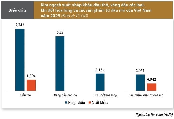 Tác động đầu tiên và trực tiếp nhất của cú sốc Trung Đông đối với Việt Nam nằm ở sự xấu đi của điều kiện thương mại do giá năng lượng nhập khẩu tăng. Năm 2025, tổng kim ngạch xuất nhập khẩu của Việt Nam đạt 930,05 tỉ USD, tương đương khoảng 181% GDP danh nghĩa. Riêng ở phương diện năng lượng, số liệu từ Cục Hải quan cho thấy, năm 2025 Việt Nam nhập khẩu 7,743 tỉ USD dầu thô, 6,820 tỉ USD xăng dầu các loại, 2,154 tỉ USD khí đốt hóa lỏng và 2,051 tỉ USD các sản phẩm khác từ dầu mỏ; trong khi xuất khẩu dầu thô và xăng dầu chỉ đạt khoảng 2,336 tỉ USD. Tính gộp, nhập siêu ròng các nhóm năng lượng chủ chốt đạt khoảng 16,43 tỉ USD, tương đương xấp xỉ 3,2% GDP năm 2025 (Biểu đồ 2).