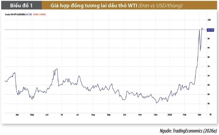 Trước hết, Trung Đông là khu vực giữ vai trò đặc biệt quan trọng đối với chuỗi cung ứng năng lượng toàn cầu, nhất là dầu thô, khí thiên nhiên hóa lỏng (LNG) và một số đầu vào trung gian như phân bón, hóa chất. Theo Cơ quan Năng lượng Quốc tế (IEA), trong năm 2025 có gần 15 triệu thùng dầu thô/ngày, tương đương khoảng 34% thương mại dầu thô toàn cầu, đi qua eo biển Hormuz; nếu tính cả dầu thô và sản phẩm dầu mỏ thì lưu lượng đạt khoảng 20 triệu thùng/ngày, tương đương khoảng 25% thương mại dầu đường biển toàn cầu (IEA, 2026). Trong khi đó, theo báo cáo của Cơ quan Thông tin Năng lượng Mỹ (EIA), khoảng một phần năm thương mại LNG toàn cầu cũng đi qua tuyến eo biển Hormuz. Viện Nghiên cứu Chính sách Thực phẩm Quốc tế (IFPRI) chỉ ra rằng, khoảng 20 - 30% xuất khẩu phân bón toàn cầu, gồm urea, amoniac, phosphates và lưu huỳnh, cũng phụ thuộc vào hành lang này. Bên cạnh rủi ro tại eo biển Hormuz, tác động của căng thẳng Trung Đông đối với Việt Nam trong giai đoạn hiện nay còn được khuếch đại bởi hiệu ứng đứt gãy kép khi khu vực Biển Đỏ - kênh đào Suez vẫn chưa phục hồi hoàn toàn. Theo báo cáo của Hội nghị Liên hợp quốc về Thương mại và Phát triển (UNCTAD), đến giữa năm 2024, dung tích tàu qua Vịnh Aden đã giảm 76% và qua kênh đào Suez giảm 70%, trong khi số chuyến qua Mũi Hảo Vọng tăng 89%; việc đi vòng qua châu Phi làm gia tăng đáng kể chiều dài hành trình, tiêu hao nhiên liệu, tiền lương thuyền viên, chi phí bảo hiểm và chi phí thuê tàu. Điều này cho thấy cú sốc Trung Đông không chỉ là cú sốc dầu mỏ, mà còn là cú sốc logistics có tác động cộng hưởng lên toàn bộ chuỗi cung ứng của Việt Nam, đặc biệt đối với các tuyến thương mại Á - Âu. Khi xung đột làm gia tăng nguy cơ gián đoạn vận tải qua các tuyến chiến lược, giá dầu thế giới thường phản ứng rất mạnh, kéo theo chi phí nhiên liệu, cước vận tải biển, bảo hiểm hàng hải và giá nguyên liệu đầu vào cùng tăng. Đối với Việt Nam, tác động này càng lớn hơn vì chi phí logistics hiện vẫn ở mức khoảng 16 - 17% GDP, cao hơn đáng kể so với mức trung bình toàn cầu, trong khi vận tải đường bộ vẫn chiếm hơn 70% khối lượng vận chuyển hàng hóa nội địa, khiến giá dầu diesel có thể truyền dẫn nhanh vào chi phí lưu thông hàng hóa trong nước. (Biểu đồ 1)