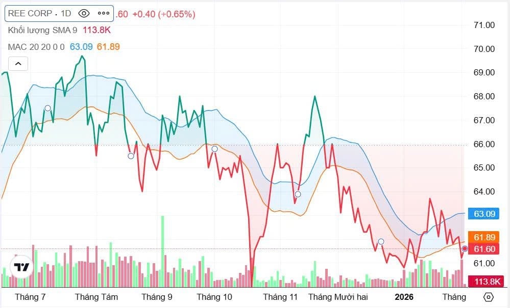 Trên thị trường chứng khoán, cổ phiếu REE lại không đồng pha với kết quả kinh doanh. Kể từ vùng đỉnh thiết lập vào cuối tháng 7/2025 đến nay, thị giá REE đã điều chỉnh hơn 12%, trong khi VN-Index tăng mạnh trong cùng giai đoạn.