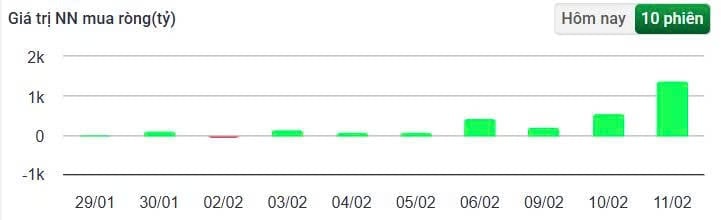 margin: 15px auto;" />Đáng chú ý, đà đi lên của cổ phiếu MBB không chỉ đến từ tâm lý thị trường mà còn được hỗ trợ rõ rệt bởi lực cầu ngoại. Riêng trong phiên 11/2, nhà đầu tư nước ngoài mua ròng tới 1.406 tỷ đồng cổ phiếu MBB, mức cao nhất toàn thị trường.