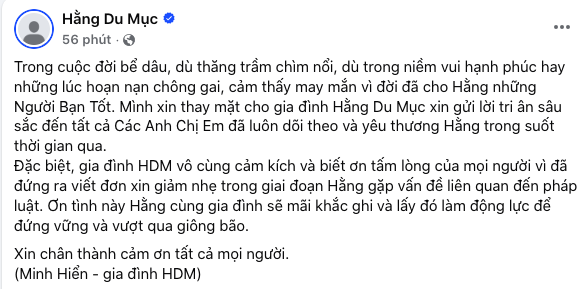 Đáng chú ý, bài viết còn thể hiện sự cảm kích đặc biệt đối với những cá nhân đã đứng ra viết đơn xin giảm nhẹ trong thời điểm Hằng gặp phải vướng mắc liên quan đến pháp luật: “Đặc biệt, gia đình Hằng Du Mục vô cùng cảm kích và biết ơn tấm lòng của mọi người vì đã đứng ra viết đơn xin giảm nhẹ trong giai đoạn Hằng gặp vấn đề liên quan đến pháp luật. Ơn tình này Hằng cùng gia đình sẽ mãi khắc ghi và lấy đó làm động lực để đứng vững và vượt qua giông bão”.