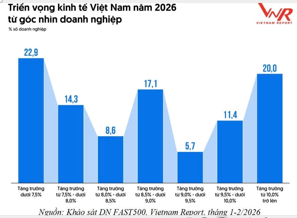 (Banker.vn) Vietnam Report vừa công bố Bảng xếp hạng 500 Doanh nghiệp tăng trưởng nhanh nhất Việt Nam (FAST500) năm 2026. Kết quả khảo sát cho thấy một bức tranh kinh tế đa sắc thái: trong khi kỳ vọng tăng trưởng được nâng lên mức kỷ lục, cộng đồng doanh nghiệp lại đang đứng trước quá trình sàng lọc tự nhiên mạnh mẽ cùng những "biến số" địa chính trị khó lường.