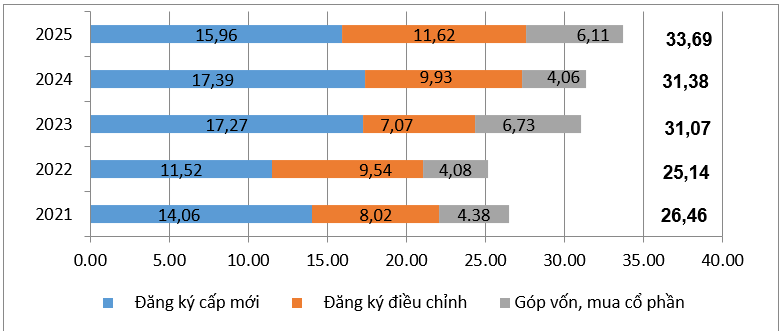 Theo Cục Thống kê, tổng vốn đầu tư nước ngoài đăng ký vào Việt Nam tính đến ngày 30/11/2025 bao gồm: Vốn đăng ký cấp mới, vốn đăng ký điều chỉnh và giá trị góp vốn, mua cổ phần của nhà đầu tư nước ngoài đạt 33,69 tỷ USD, tăng 7,4% so với cùng kỳ năm trước.