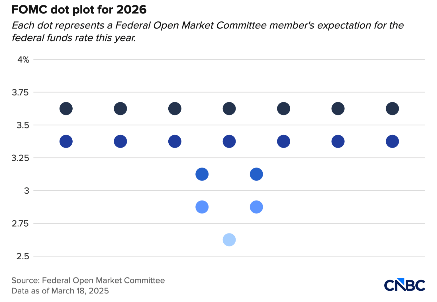 Trong số 19 thành viên tham gia FOMC, có 7 người dự báo lãi suất sẽ không thay đổi trong năm nay, tăng thêm 1 người so với cập nhật hồi tháng 12. Dù dự báo cho các năm tiếp theo còn phân tán, kịch bản trung vị cho thấy sẽ có thêm một lần giảm lãi suất vào năm 2027, trước khi ổn định quanh mức 3,1% trong dài hạn.