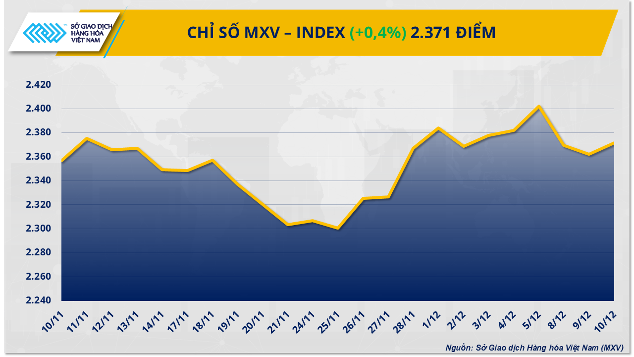 (Banker.vn) Sau phiên họp chính sách kéo dài hai ngày, Ngân hàng Dự trữ liên bang Mỹ (FED) đã hạ lãi suất thêm 25 điểm cơ bản, đánh dấu lần cắt giảm thứ 3 trong năm nay. Động thái này đã kích hoạt tâm lý lạc quan của nhà đầu tư, đưa dòng tiền quay lại thị trường hàng hóa trong phiên giao dịch ngày 10/12. Đóng cửa, chỉ số MXV-Index tăng 0,4% lên 2.371 điểm.