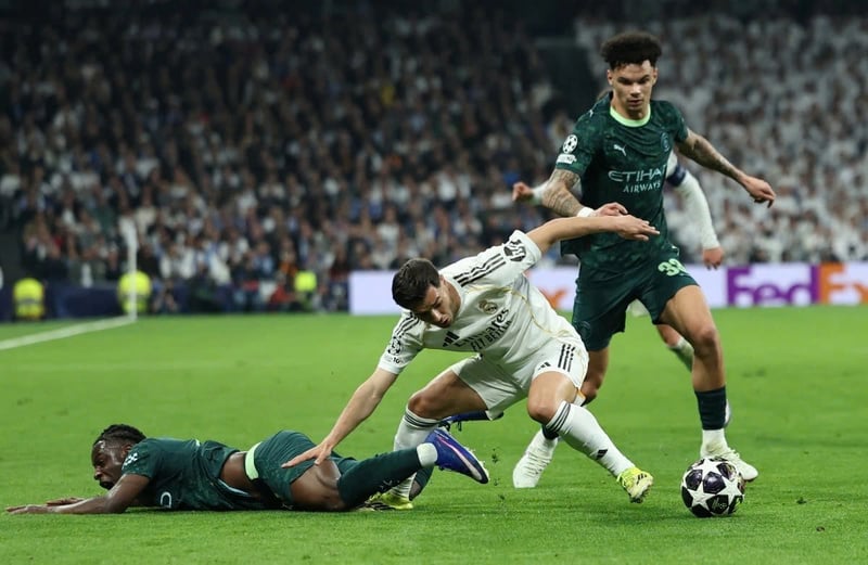 Sau khi vươn lên dẫn trước 2 bàn, Real Madrid thi đấu chủ động, kiểm soát thế trận tốt khiến Man City gặp nhiều khó khăn trong việc triển khai tấn công. Đội khách có cơ hội từ tình huống đá phạt bên cánh phải, nhưng đường chuyền sau đó đã bị hậu vệ Real Madrid cản phá.