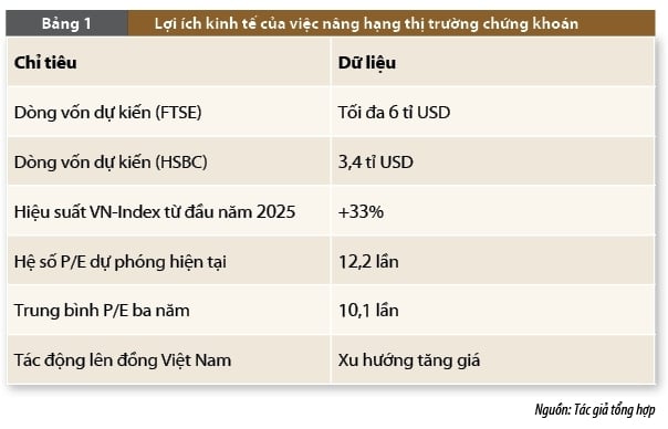 Tác động dài hạn của việc FTSE Russell nâng hạng thị trường chứng khoán Việt Nam là ở việc hình thành nền tảng cho sự tích hợp sâu hơn vào chuỗi vốn toàn cầu. Khi Việt Nam trở thành điểm đến quen thuộc trong danh mục của các quỹ đầu tư lớn, chi phí huy động vốn quốc tế sẽ giảm đáng kể, đồng thời mở rộng cơ hội hợp tác tài chính với các trung tâm đầu tư hàng đầu như Singapore, Hồng Kông, Seoul và Tokyo. Hệ thống ngân hàng và công ty chứng khoán trong nước cũng sẽ hưởng lợi từ việc nâng cấp dịch vụ lưu ký, thanh toán, môi giới và quản lý tài sản, tạo bước tiến lớn trong chuyển đổi sang mô hình tài chính số toàn diện. (Bảng 1)