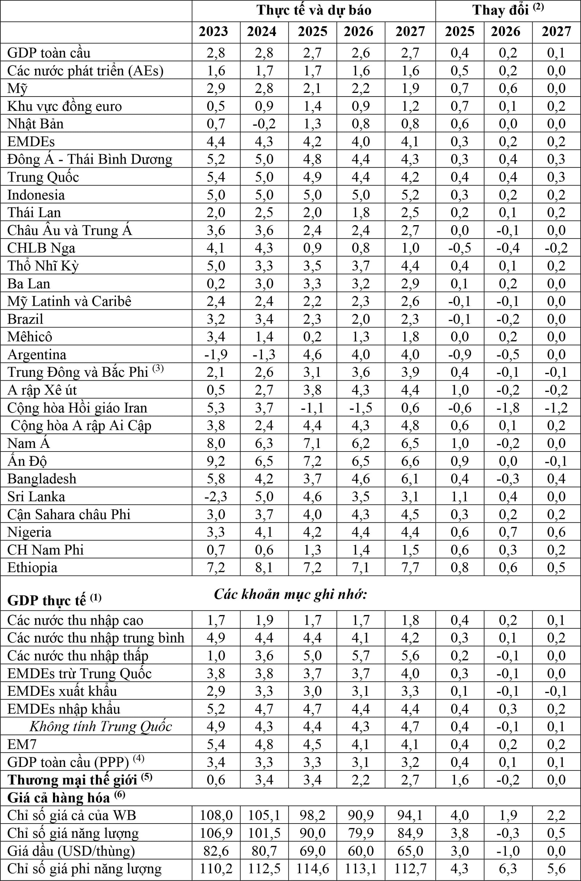 Với mức tăng trưởng trung bình khoảng 4,2% trong năm 2025, GDP tại EMDEs tăng cao hơn kỳ vọng. Hoạt động kinh tế tại Trung Quốc tăng cao, chủ yếu là nhờ các gói kích thích tài khóa và xuất khẩu sang các thị trường ngoài Mỹ tăng cao. Nhiều EMDEs cũng hưởng lợi từ các nỗ lực mở rộng xuất khẩu, trong khi hoạt động đầu tư tăng vững. Trong năm 2026-2027, kinh tế EMDEs sẽ giảm xuống mức tăng trung bình 4,0%, trong đó GDP giảm tốc tại Trung Quốc sẽ được bù đắp bởi xu hướng cải thiện kinh tế năm 2027 tại EMDEs khác. Kinh tế Trung Quốc sẽ giảm tốc do tác động của các gói kích thích tài khóa liên tiếp và những giải pháp hỗ trợ khác bị lấn át bởi niềm tin yếu ớt trong bối cảnh kinh tế suy giảm dài hạn.