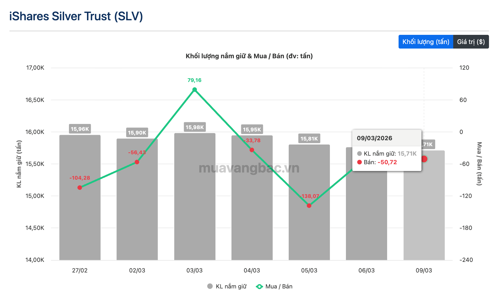 Dữ liệu muavangbac.vn, phiên giao dịch ngày 9/3 cho thấy, quỹ bạc lớn nhất thế giới iShares Silver Trust (SLV) do BlackRock quản lý mặc dù tiếp tục bán ra nhưng số lượng bán chỉ gần 51 tấn, tương đương phiên 6/3, trong khi phiên giao dịch ngày 5/3 quỹ này từng bán hơn 138 tấn bạc.