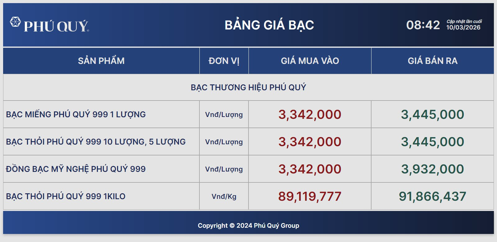 Cụ thể, bạc miếng Phú Quý 1 lượng mua vào - bán ra là 3,342 - 3.445 triệu đồng/lượng; bạc thỏi Phú Quý mua vào - bán ra là 89,119 - 91,866 triệu đồng/kg. Trong vòng 1 tháng qua, giá bạc Phú Quý đã tăng 15%.
