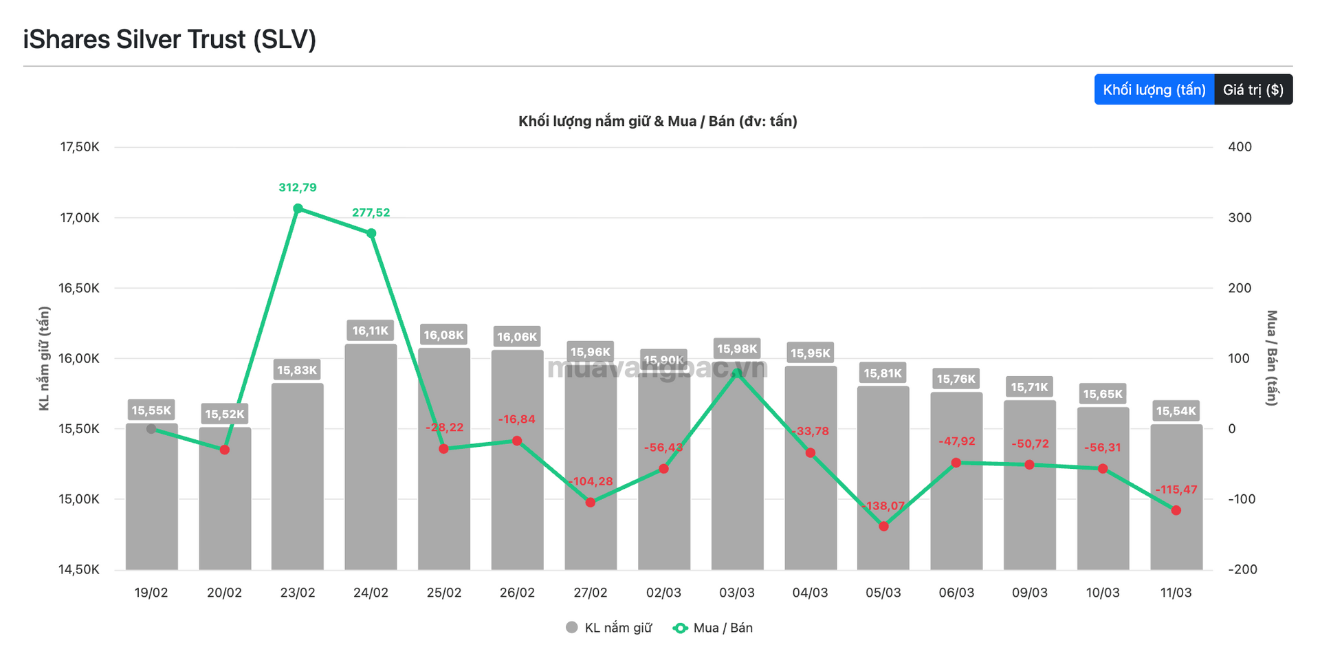 Dữ liệu muavangbac.vn, phiên giao dịch ngày 11/3 cho thấy, quỹ bạc lớn nhất thế giới iShares Silver Trust (SLV) do BlackRock quản lý tiếp tục bán ra hơn hơn 115 tấn, đây là phiên bán ròng thứ 6 liên tiếp của quỹ này.