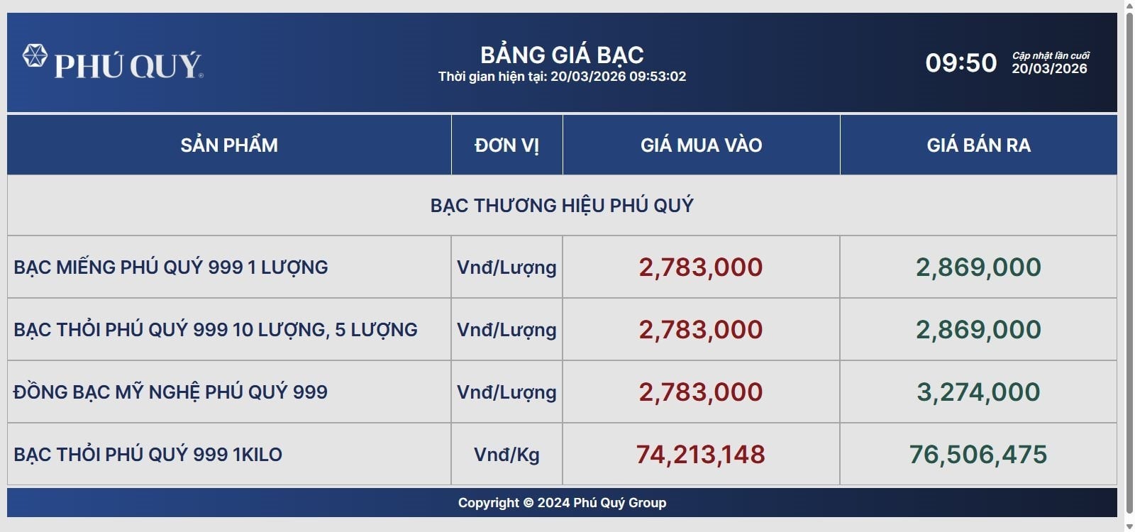 Khảo sát lúc 9h50, bạc miếng Phú Quý 1 lượng mua vào - bán ra là 2,783 - 2,869 triệu đồng/lượng; bạc thỏi Phú Quý mua vào - bán ra là 74,213 - 76,506 triệu đồng/kg. Thống kê cho thấy, trong vòng 1 tháng qua, giá bạc Phú Quý giảm 3,3%, trong vòng 1 năm qua giá bạc tăng 121,3%.