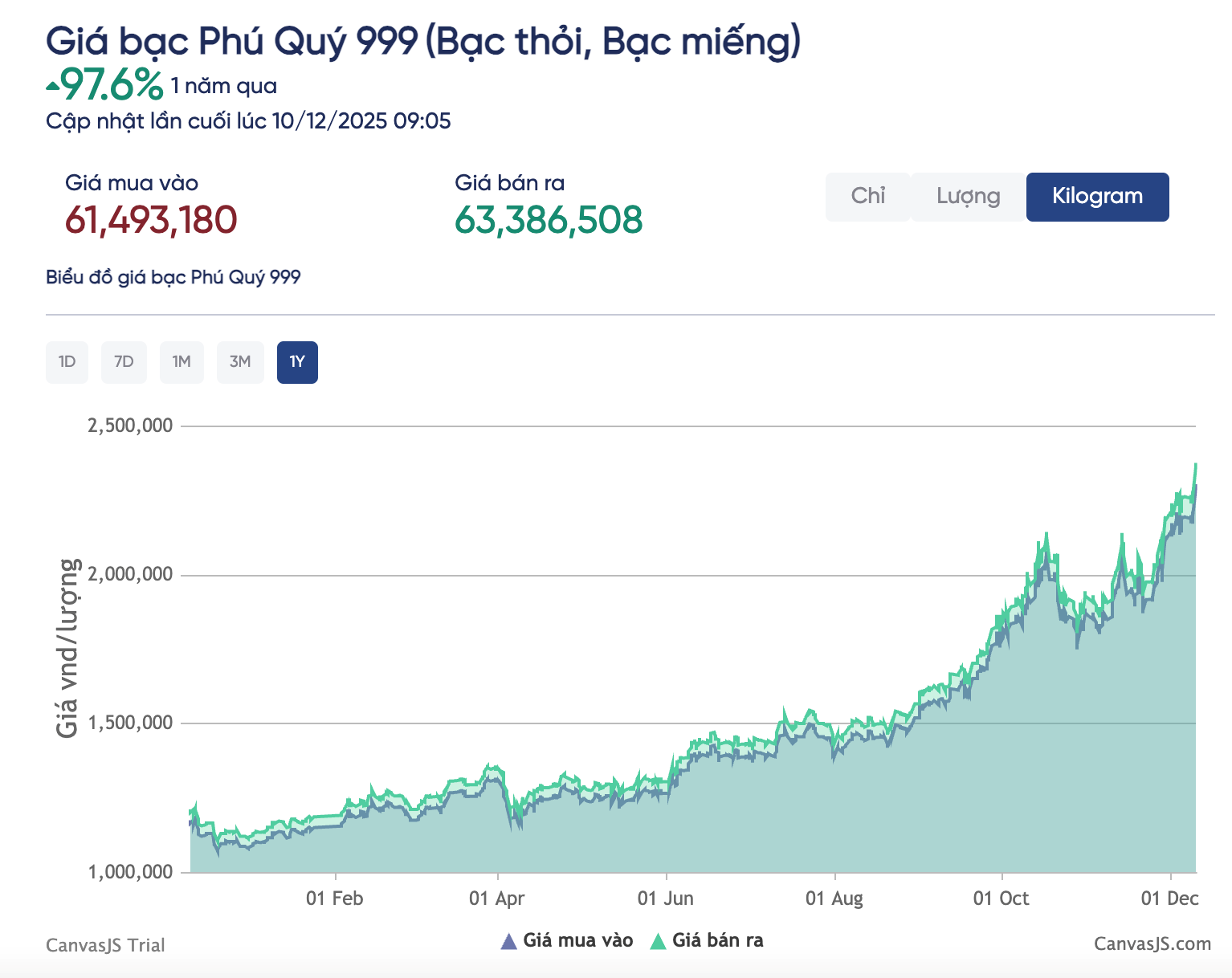 Thị trường trong nước, bạc Phú Quý lần đầu tiên vượt 63 triệu đồng/kg. 9h00 sáng 10/12, Phú Quý công bố giá mua bán bạc 1 lượng lần lượt là 2,306 triệu đồng và 2,377 triệu đồng, tương ứng 1 kg giá mua, bán lần lượt là 61,493 triệu đồng và 63,386 triệu đồng.