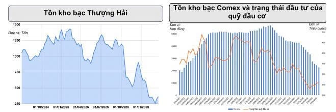 Ở góc độ cung - cầu, dữ liệu tồn kho cho thấy sự phân hóa rõ nét. Tồn kho bạc tại Thượng Hải tăng hơn 35 tấn lên trên 362 tấn, trong khi tồn kho tại Comex giảm mạnh hơn 279 tấn. Đáng chú ý, lượng bạc sẵn sàng giao hiện chỉ chiếm khoảng 25% tổng tồn kho tại Comex, mức tương đối thấp.