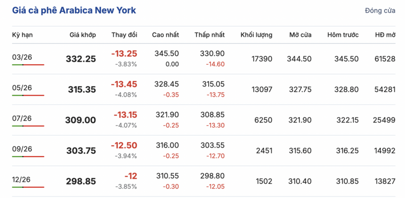 Tương tự, trên sàn New York, giá cà phê Arabica lại tiếp tục ghi nhận phiên sụt giảm mạnh đồng loạt trong các kỳ giao hàng. Cụ thể, kỳ giao tháng 3/2026 giảm mạnh 13,25 cent/lb, xuống mức 332,25 cent/lb. Hợp đồng giao tháng 12/2026 cũng giảm sâu 12,0 cent/lb, đạt mức 298,85 cent/lb.