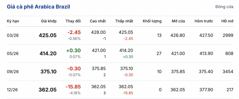 Kết thúc phiên giao dịch gần nhất, cà phê Arabica Brazil tiếp tục ghi nhận phiên biến động trái chiều trong các kỳ giao hàng. Cụ thể: kỳ hạn tháng 3/2026 đạt mức 425,05 cent/lb, giảm nhẹ 2,45 cent/lb so với hôm qua. Trái lại, kỳ giao hàng tháng 5/2026 lại ghi nhận tăng nhẹ 0,3 cent/lb, lên mức 414,2 cent/lb.