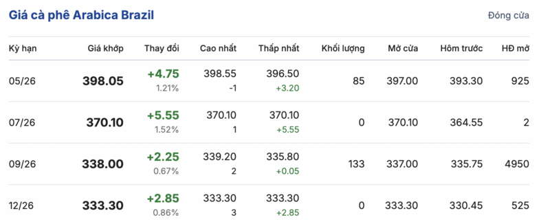 Kết thúc phiên giao dịch gần nhất, giá cà phê Arabica trên sàn Brazil cũng ghi nhận phiên tăng giá. Cụ thể, kỳ hạn tháng 5/2026 đạt mức 398,05 cent/lb, tăng 4,75 cent/lb so với hôm qua. Trong khi đó, kỳ giao hàng tháng 12/2026 ghi nhận tăng nhẹ 2,85 cent/lb, lên mức 333,3 cent/lb.