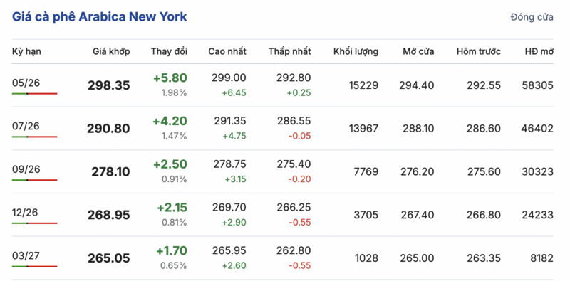 Tương tự, trên sàn New York, giá cà phê Arabica cũng ghi nhận phiên phục hồi, tăng đồng loạt. Cụ thể, kỳ giao tháng 5/2026 tăng 5,8 cent/lb, đạt mức 298,35 cent/lb. Hợp đồng giao kỳ hạn tháng 3/2027 cũng tăng nhẹ 1,7 cent/lb, đạt mức 265,05 cent/lb.