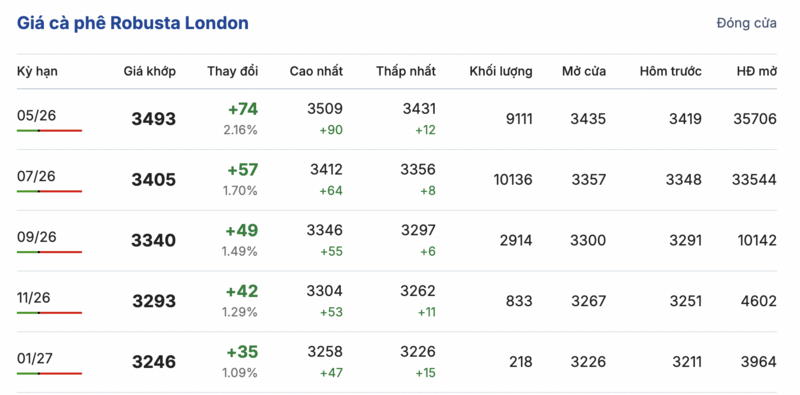 Cụ thể, trên sàn giao dịch London, giá cà phê Robusta sáng nay ghi nhận phiên đảo chiều, tăng đồng loạt trong các kỳ giao hàng so với phiên giao dịch trước. Trong đó, kỳ giao tháng 3/2026 tăng mạnh 74 USD/tấn, đạt mức 3.493 USD/tấn. Cùng chiều, hợp đồng giao kỳ hạn tháng 1/2027 cũng tăng 35 USD/tấn, lên mức 3.246 USD/tấn.