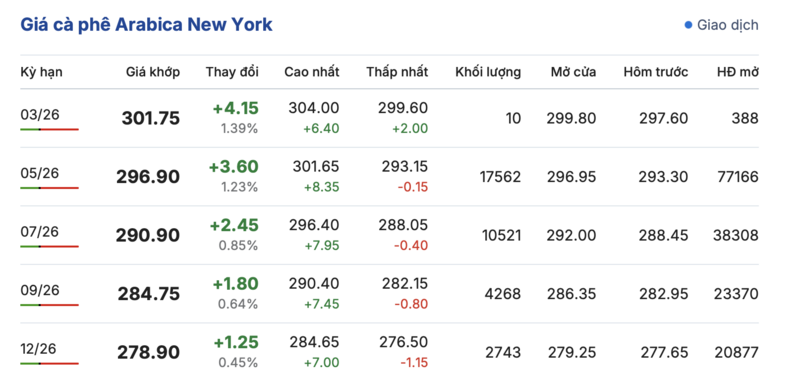 Trên sàn New York, giá cà phê Arabica tiếp tục ghi nhận phiên tăng nhẹ đồng loạt trong các kỳ giao hàng. Cụ thể, kỳ giao tháng 3/2026 tăng nhẹ 4,15 cent/lb, đạt mức 301,75 cent/lb. Cùng chiều, hợp đồng giao tháng 12/2026 cũng tăng nhẹ 1,25 cent/lb, đạt mức 278,9 cent/lb.