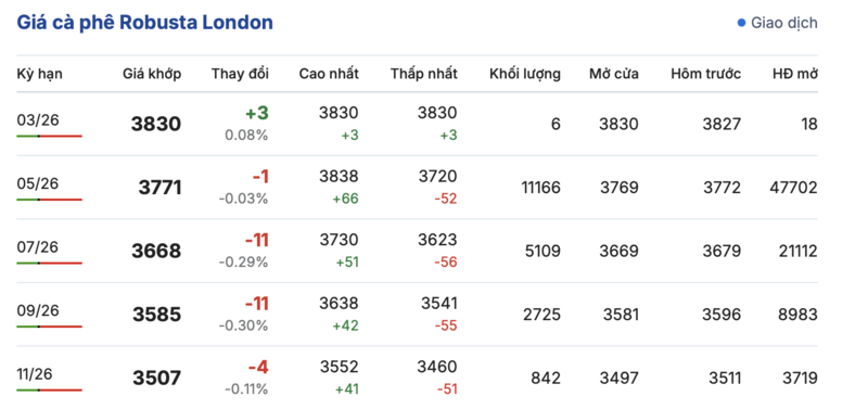 Cụ thể, kết thúc phiên giao dịch gần nhất, giá cà phê Robusta tại London ghi nhận phiên biến động trái chiều trong các kỳ giao hàng. Trong đó, kỳ giao tháng 1/2026 tăng nhẹ 3,0 USD/tấn, đạt mức 3830 USD/tấn. Trái lại, hợp đồng giao kỳ hạn tháng 11/2026 giảm nhẹ 4,0 USD/tấn, xuống mức 3507 USD/tấn.
