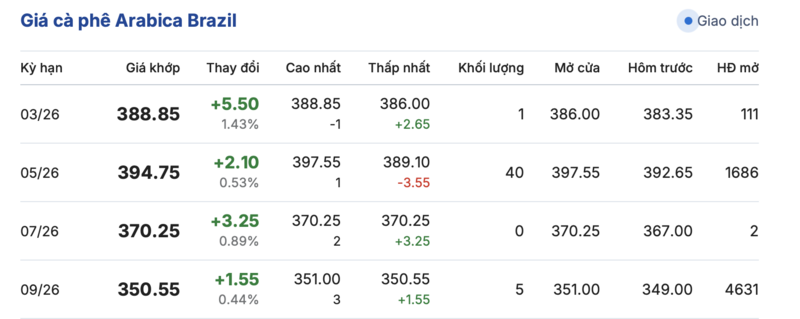 Tương tự, kết thúc phiên giao dịch gần nhất, giá cà phê Arabica trên sàn Brazil ghi nhận phiên tăng đồng loạt trong các kỳ giao hàng. Cụ thể: kỳ hạn tháng 3/2026 đạt mức 388,85 cent/lb, tăng mạnh 5,5 cent/lb so với hôm qua. Cùng chiều, kỳ giao hàng tháng 5/2026 ghi nhận tăng nhẹ 1,55 cent/lb, lên mức 350,55 cent/lb.