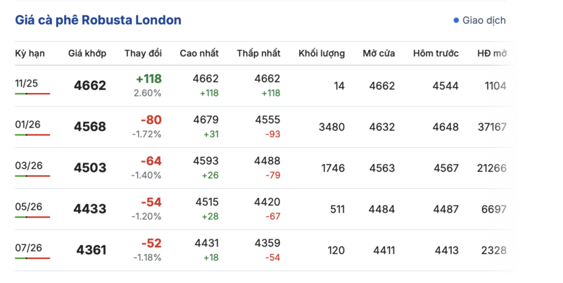 Kết thúc phiên giao dịch gần nhất, giá cà phê Robusta tại London biến động trái chiều trong các kỳ giao hàng. Cụ thể, kỳ giao tháng 11/2025 tăng mạnh 118 USD/tấn, lên mức 4.662 USD/tấn. Trong khi hợp đồng giao kỳ hạn tháng 7/2026 giảm 52 USD/tấn, xuống mức 4.361 USD/tấn.