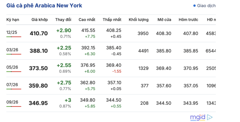 Trong khi đó, trên sàn New York, giá cà phê Arabica lại ghi nhận sự tăng giá đồng loạt trong các kỳ giao hàng. Kỳ giao tháng 12/2025 tăng nhẹ 2,9 cent/lb, lên mức 410,7 cent/lb. Hợp đồng giao tháng 9/2026 tăng 3,0 cent/lb, đạt mức 346,95 cent/lb.