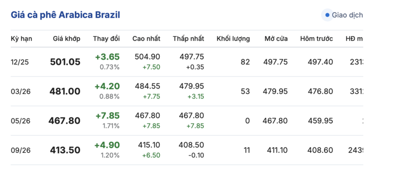 Kết thúc phiên giao dịch gần nhất, giá cà phê Arabica Brazil cũng tăng đồng loạt so với phiên giao dịch trước. Cụ thể: kỳ giao hàng tháng 12/2025 là 501,05 cent/lb, tăng 3,65 cent/lb so với phiên giao dịch trước. Kỳ giao hàng tháng 9/2026 tăng 4,9 cent/lb, lên mức 413,5 cent/lb.