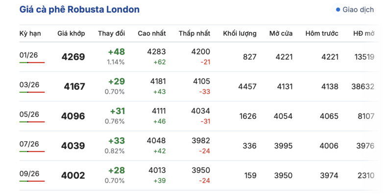 Kết thúc phiên giao dịch gần nhất, giá cà phê Robusta tại London tăng đồng loạt qua các kỳ giao hàng. Cụ thể, kỳ giao tháng 1/2026 tăng 48 USD/tấn, đạt mức 4269 USD/tấn. Trong khi hợp đồng giao kỳ hạn tháng 9/2026 tăng 28 USD/tấn, lên mức 4002 USD/tấn.