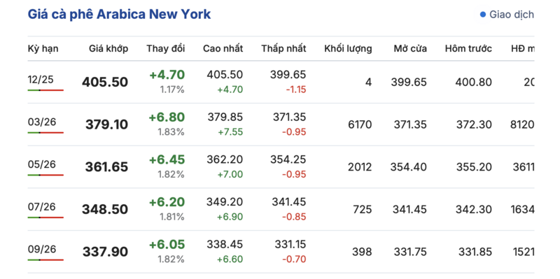 Trong khi đó, trên sàn New York, giá cà phê Arabica cũng ghi nhận tăng mạnh liên tục trong các kỳ giao hàng. Cụ thể, kỳ giao tháng 12/2025 tăng 4,7 cent/lb, đạt mức 405,5 cent/lb. Hợp đồng giao tháng 9/2026 tăng mạnh 6,05 cent/lb, đạt mức 337,9 cent/lb.