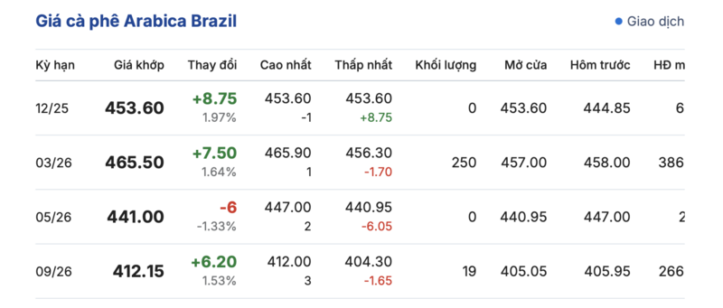 Kết thúc phiên giao dịch gần nhất, giá cà phê Arabica Brazil biến động trái chiều so với phiên giao dịch trước. Cụ thể: kỳ giao hàng tháng 12/2025 đạt mức 453,6 cent/lb, tăng mạnh 8,75 cent/lb so với hôm qua. Trái lại, kỳ giao hàng tháng 5/2026 lại giảm nhẹ 6 cent/lb, đạt mức 441,0 cent/lb.